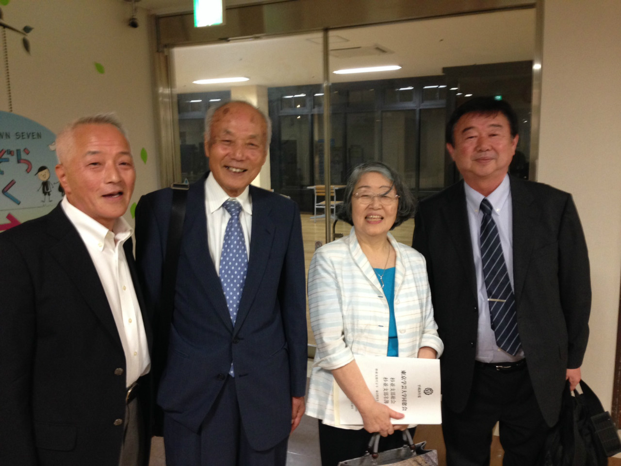 6月20日(金) 荻窪タウンセブンにて、平成26年度の支部総会と懇親会が開催されました。総会では今年度の組織及び事業計画が承認されました。近々、会員の皆様には、学校委員を通して総会資料と会員名簿がお手元に届くかと思います。懇親会では、馬場理事長から前支部長の吉井先生に感謝滋養が手渡されました。また、恒例の「若草燃ゆる」の後には「日本一コールとエール」が会場に響きました。まだ、総会・懇親会に参加されてことのない先生方には、是非、一歩踏み込んで参加していただき、ともに学んだ小金井キャンパスの同窓として昔話に花を咲かせていただきたいと思います。